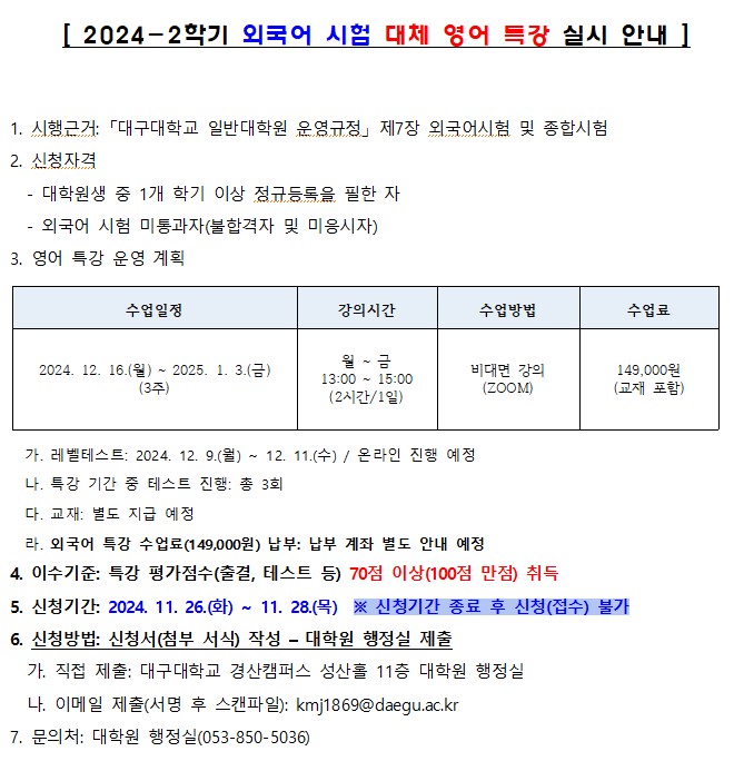 2024학년도 2학기 외국어 시험 대체 영어 특강 실시 안내